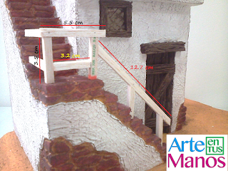 Hoy compartimos un nuevo proyecto, es una casa para belenes, en la que su diseño comprende, escaleras y barandales miniatura, hecho en porexpand o icopor y madera balsa, usamos técnica en estuco (pasta de yeso) y suelo en arena.
