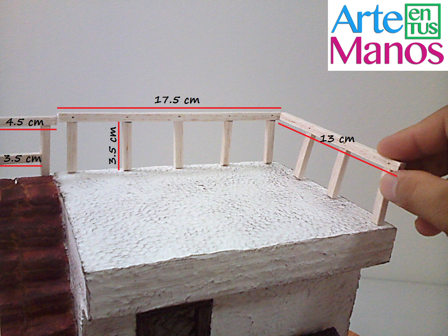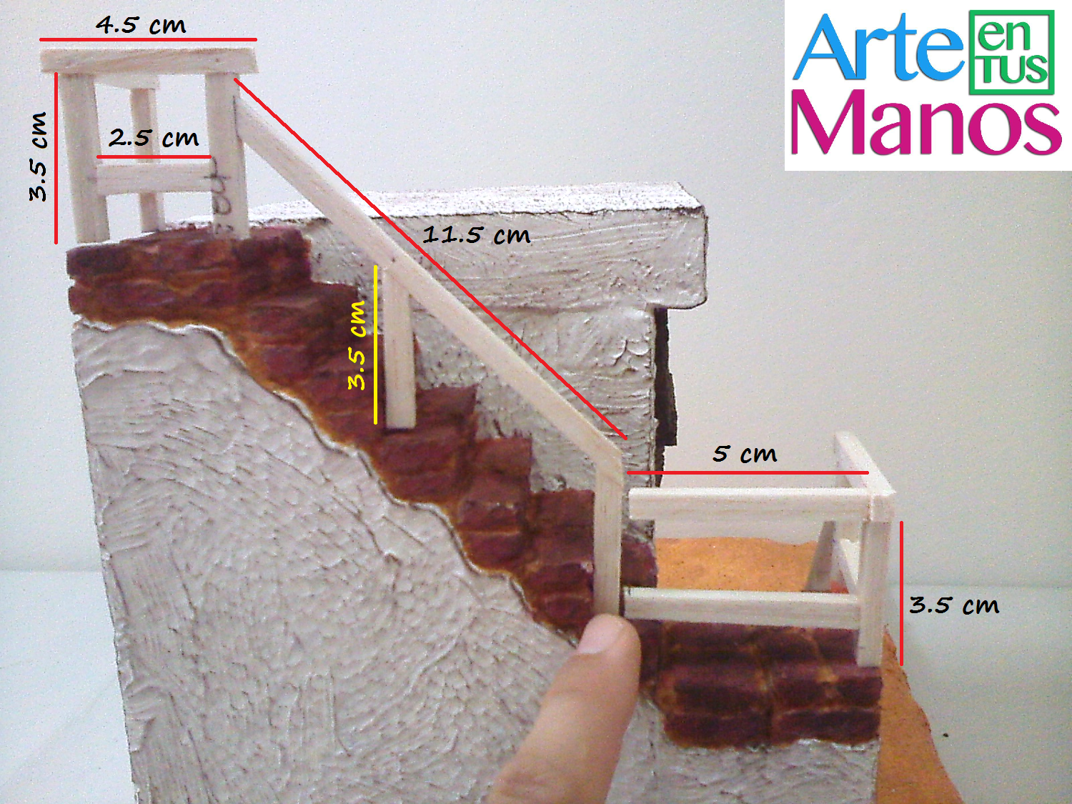Hoy compartimos un nuevo proyecto, es una casa para belenes, en la que su diseño comprende, escaleras y barandales miniatura, hecho en porexpand o icopor y madera balsa, usamos técnica en estuco (pasta de yeso) y suelo en arena.